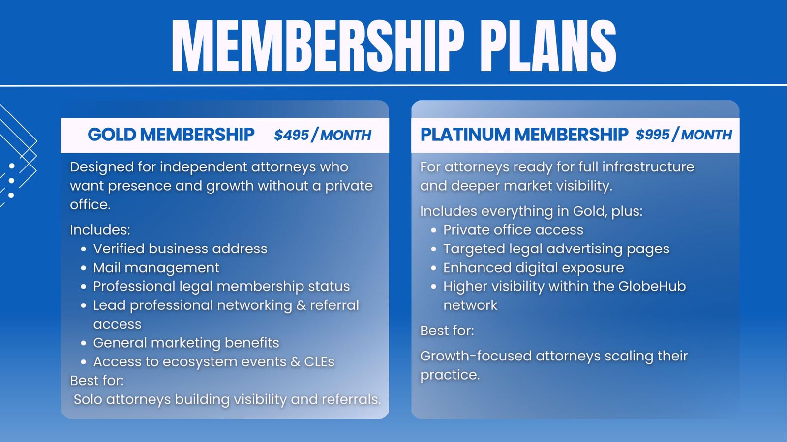 | Scale (12+ Months) | Hire assistants, co-counsel, and open satellite offices within GlobeHub network. | Support with infrastructure, leads, and shared admin pool. |